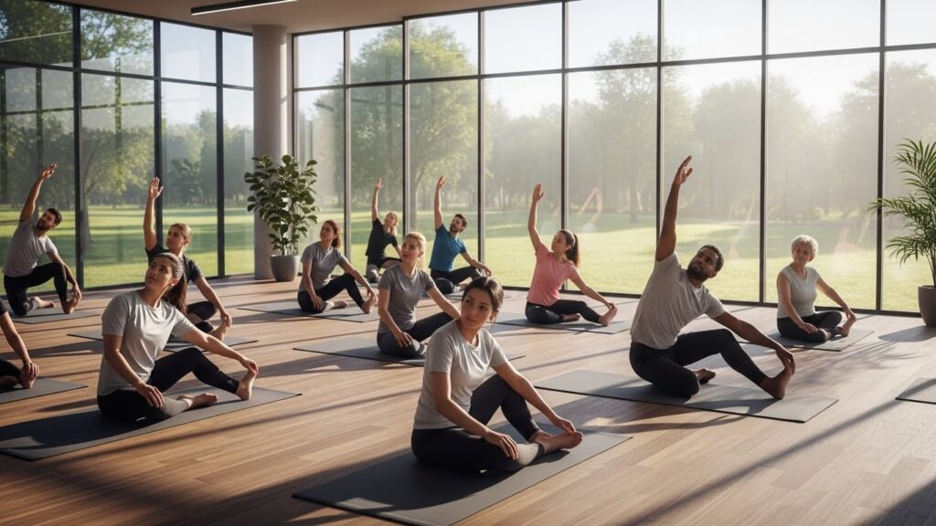 오전에는 인터벌 트레이닝, 오후에는 근력 운동과 줌바, 저녁에는 스트레칭이나 요가가 이어집니다.